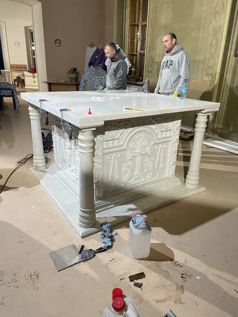Престол изготовлен из мрамора, будет служить как постоянный (так же, как в центральном приделе). Установка закончена и он сохнет на струбцинах.